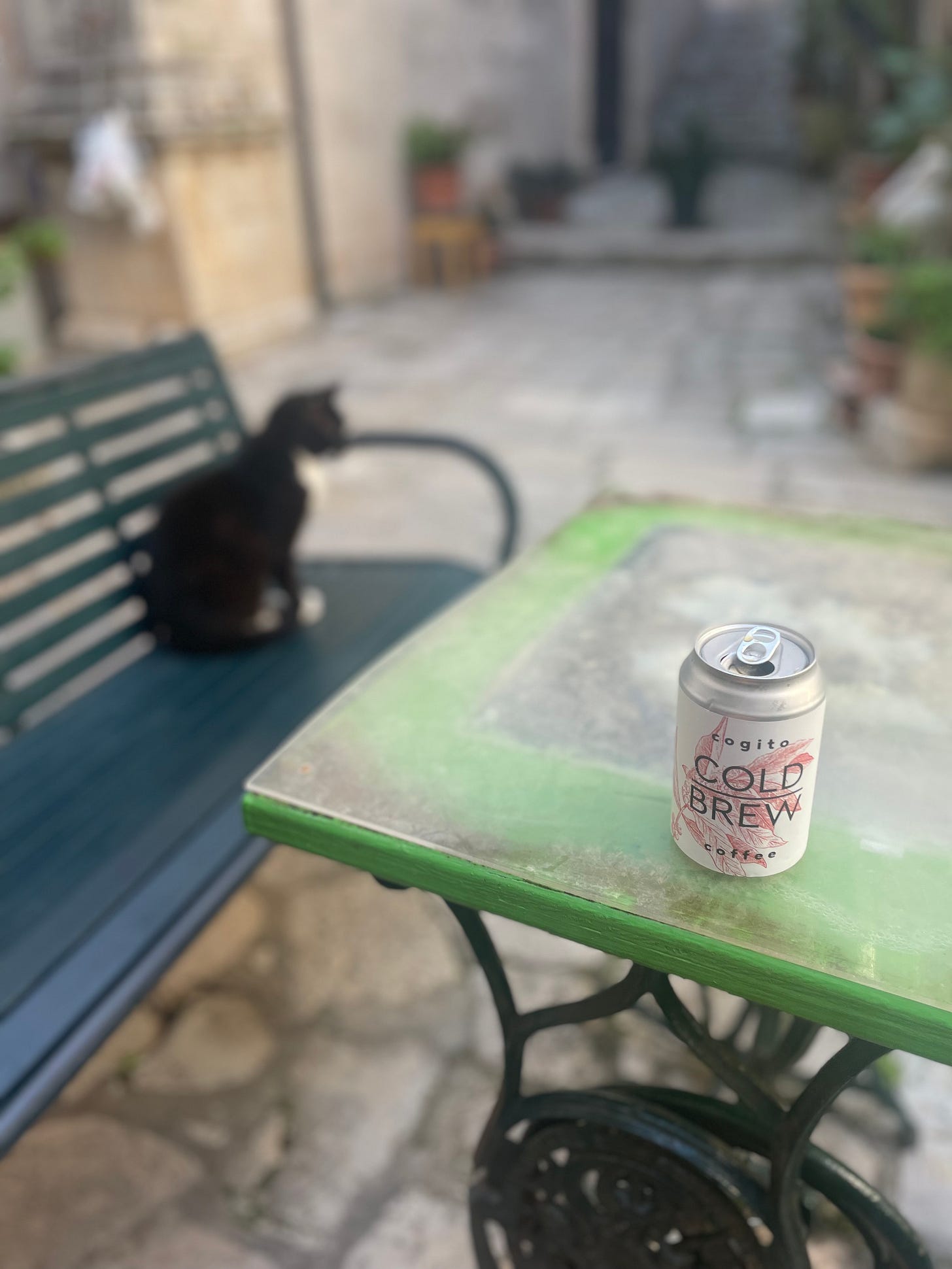 Still early, the tourists slept, granting me a sense of intimacy with this city as I roamed silently. Not even classical music had filled the air just yet. I found the coffee shop, ordered a cold brew, and searched for a place to sit. Two benches rested in an L-shape with a table in between within a small garden. Plants climbed the walls, flower pots paraded around, cats sat everywhere. Clean, it seemed as if the community cared for these little lions well. In return, they kept the streets free of rodents. So, I sat with the cats.